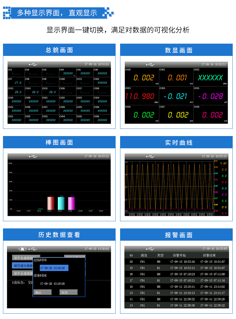 無(wú)紙記錄儀是將工業(yè)現(xiàn)場(chǎng)的各種需要監(jiān)視記錄的輸入信號(hào),比如熱電阻和熱電偶的溫度信號(hào)、流量計(jì)的流量信號(hào)、 壓力變送器的壓力信號(hào)等。通過(guò)高性能微處理器進(jìn)行數(shù)據(jù)處理,一方面在高分辨液晶顯示屏幕上以多種形式的畫(huà)面顯 示出來(lái),另一方面把這些監(jiān)察信號(hào)的數(shù)據(jù)存放在儀表內(nèi)部的大容量存儲(chǔ)芯片內(nèi),以便在儀表上直接進(jìn)行數(shù)據(jù)和圖形查 詢、翻閱和打印。