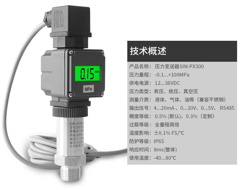 SIN-PX300型數顯壓力變送器采用無縫焊接結構,可批量化生產,經濟、可靠,具有良好的適應性,可應用于各種復雜的環境,該產品輸出形式多樣,壓力接口可提供定制,滿足您的使用需求。同時數顯壓力變送器帶有現場顯示功能,能夠更加直觀的顯示現場的壓力波動情況。廣泛應用于工業自動化設備配套以及石油、化工、冶金、電力等控制領域。